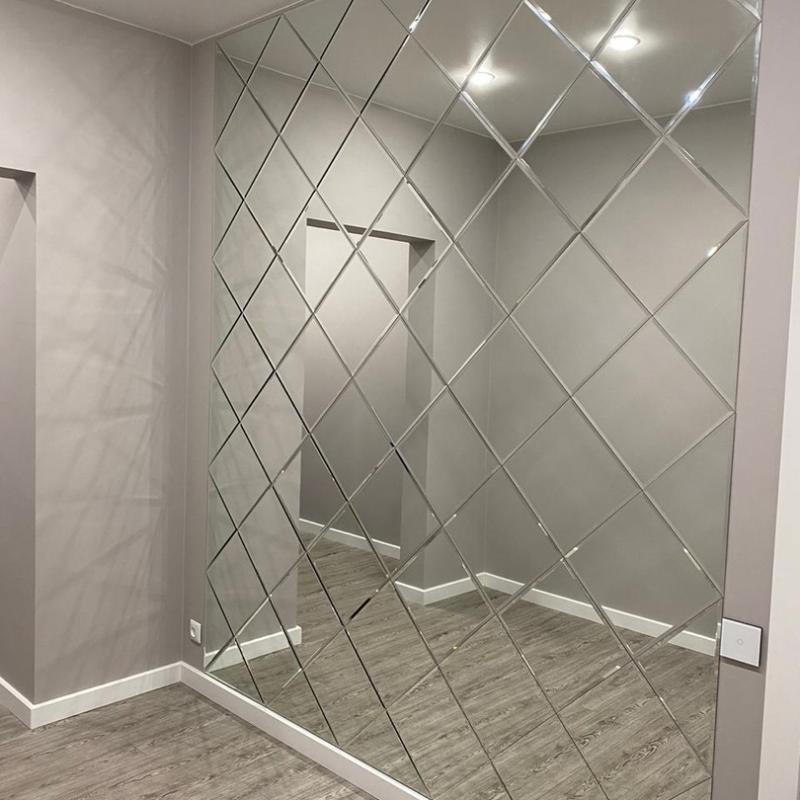 Использована серебристая квадратная зеркальная плитка