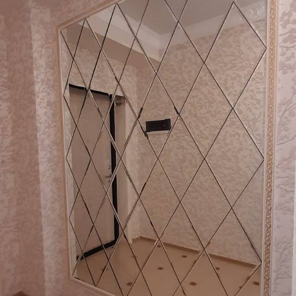 Использована квадратная серебристая зеркальная плитка размером 18х18.