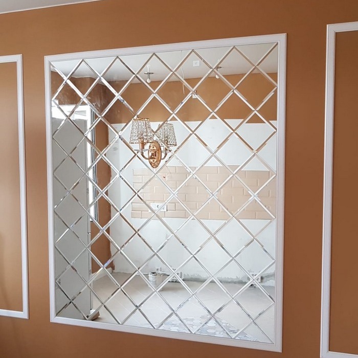 Зеркально панно было сделано из зеркальной плитки 30х30 см, размер панно 255х255 см