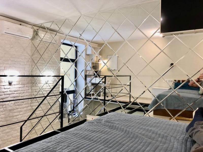 Использовалась серебристая зеркальная плитка формы "вытянутый ромб".